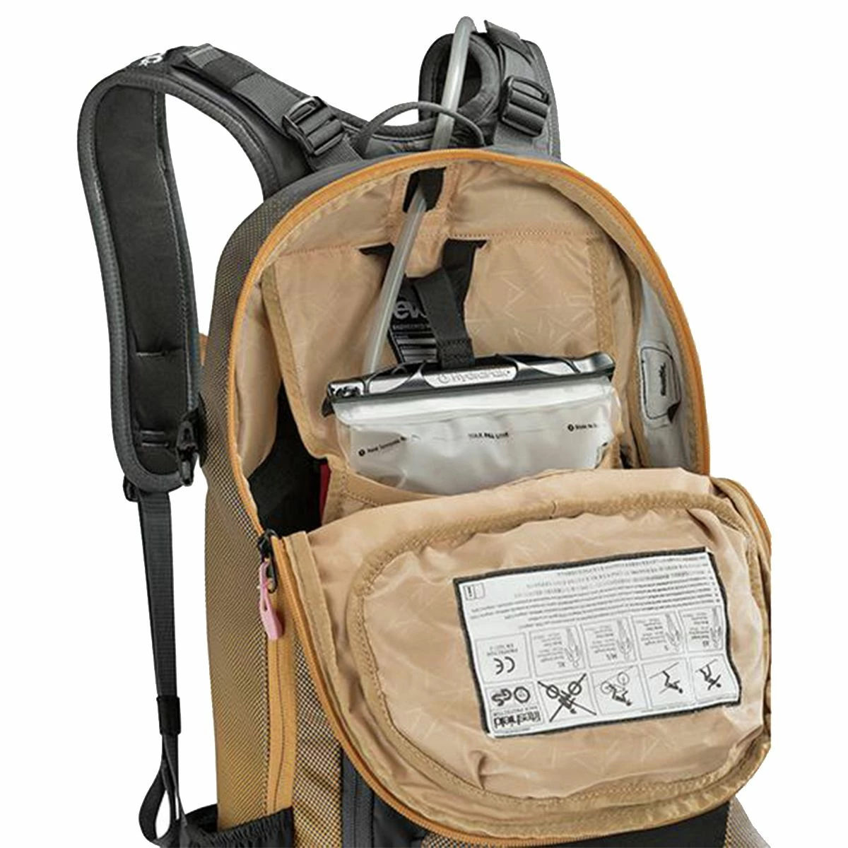 Because technical trails and enduro courses often have nasty consequences for missing your line, Evoc integrates a certified protector into the rear panel that disperses crushing blows otherwise transferred to your back and spine. This certified back protector remains lightweight and flexible, so you don’t feel like some armored knight on the trails or suffer from a loss of essential motion. It’s complemented with padded, ergonomic straps, plus a large hip belt and adjustable sternum strap for a steady fit across rugged trails.