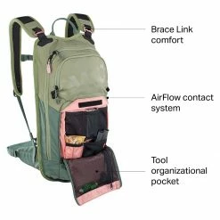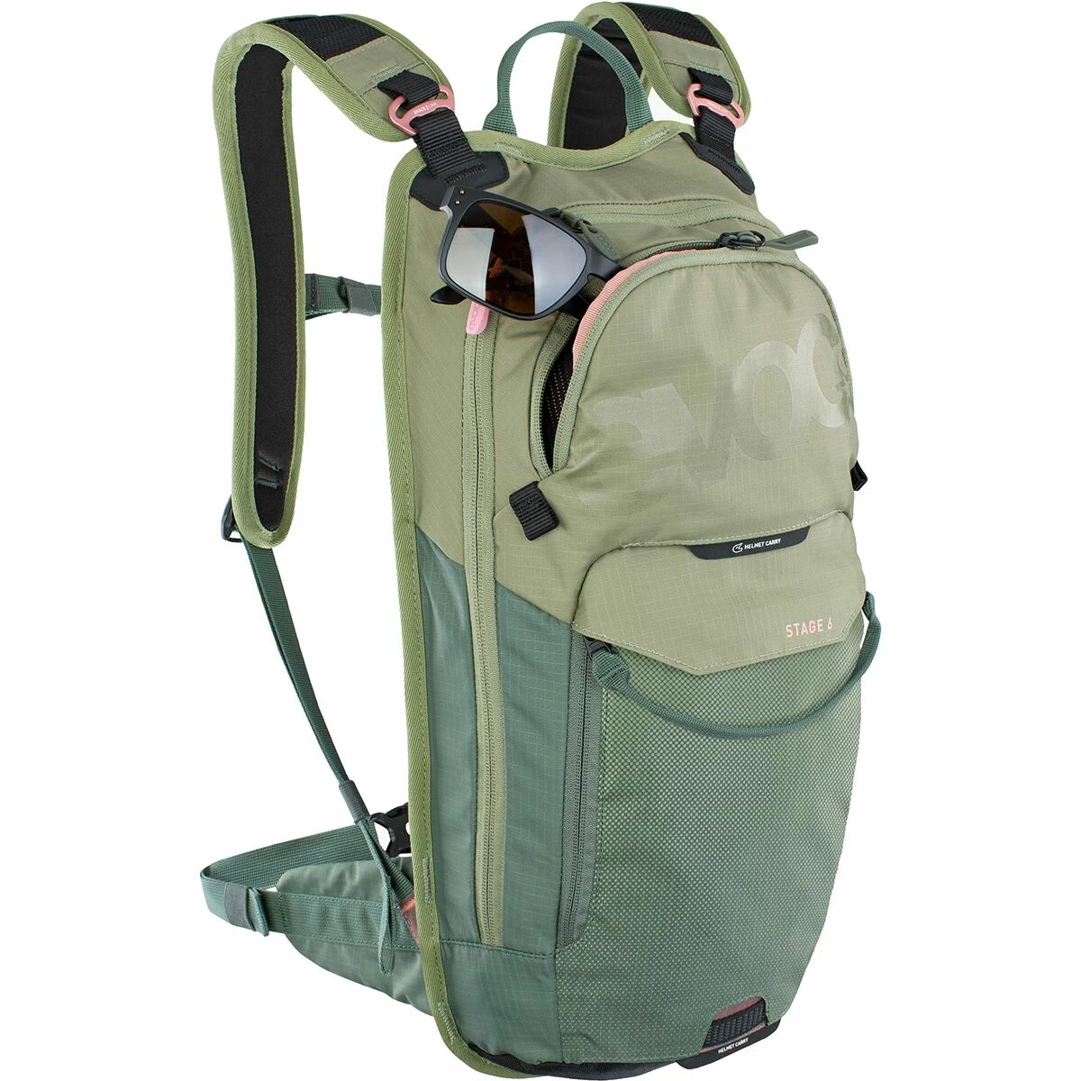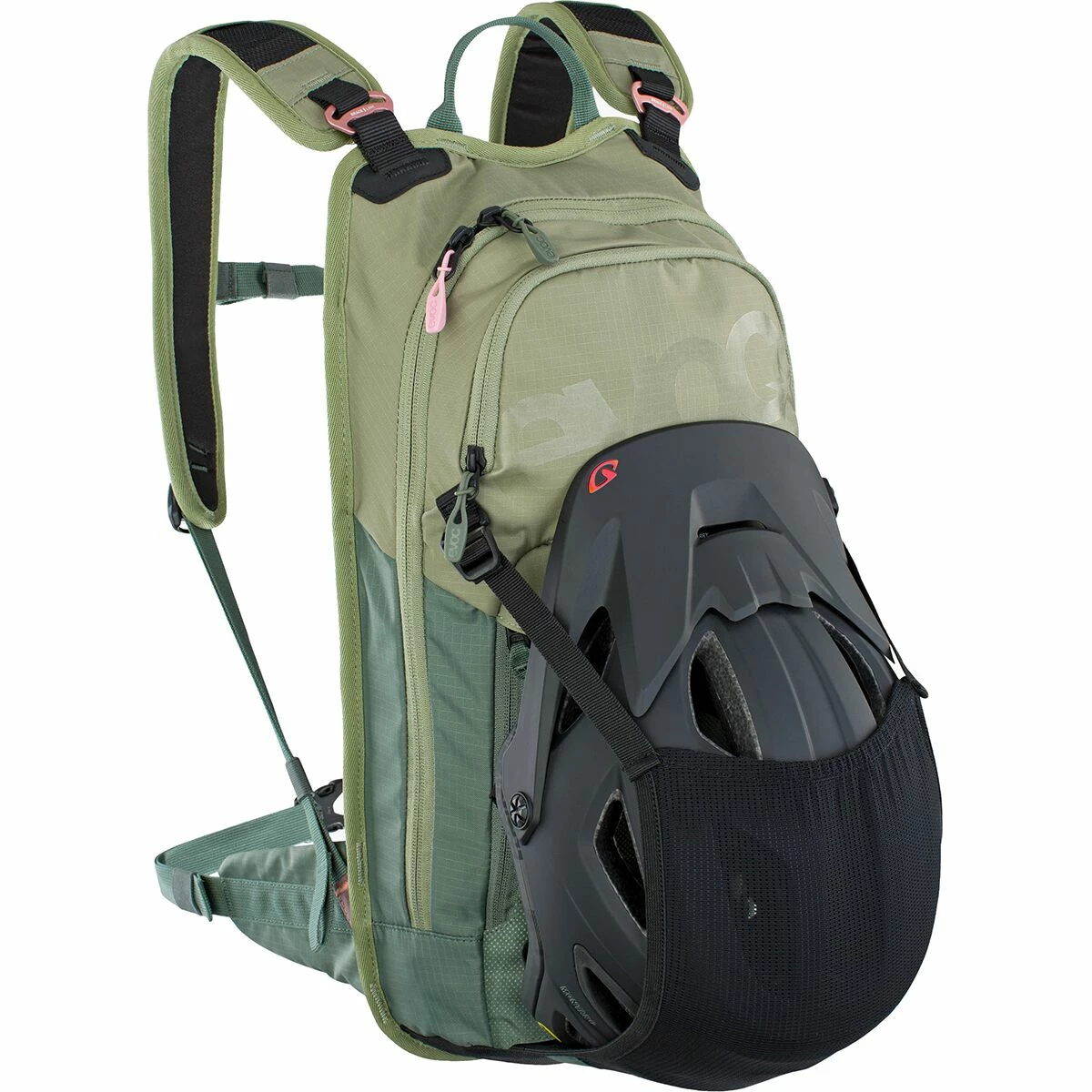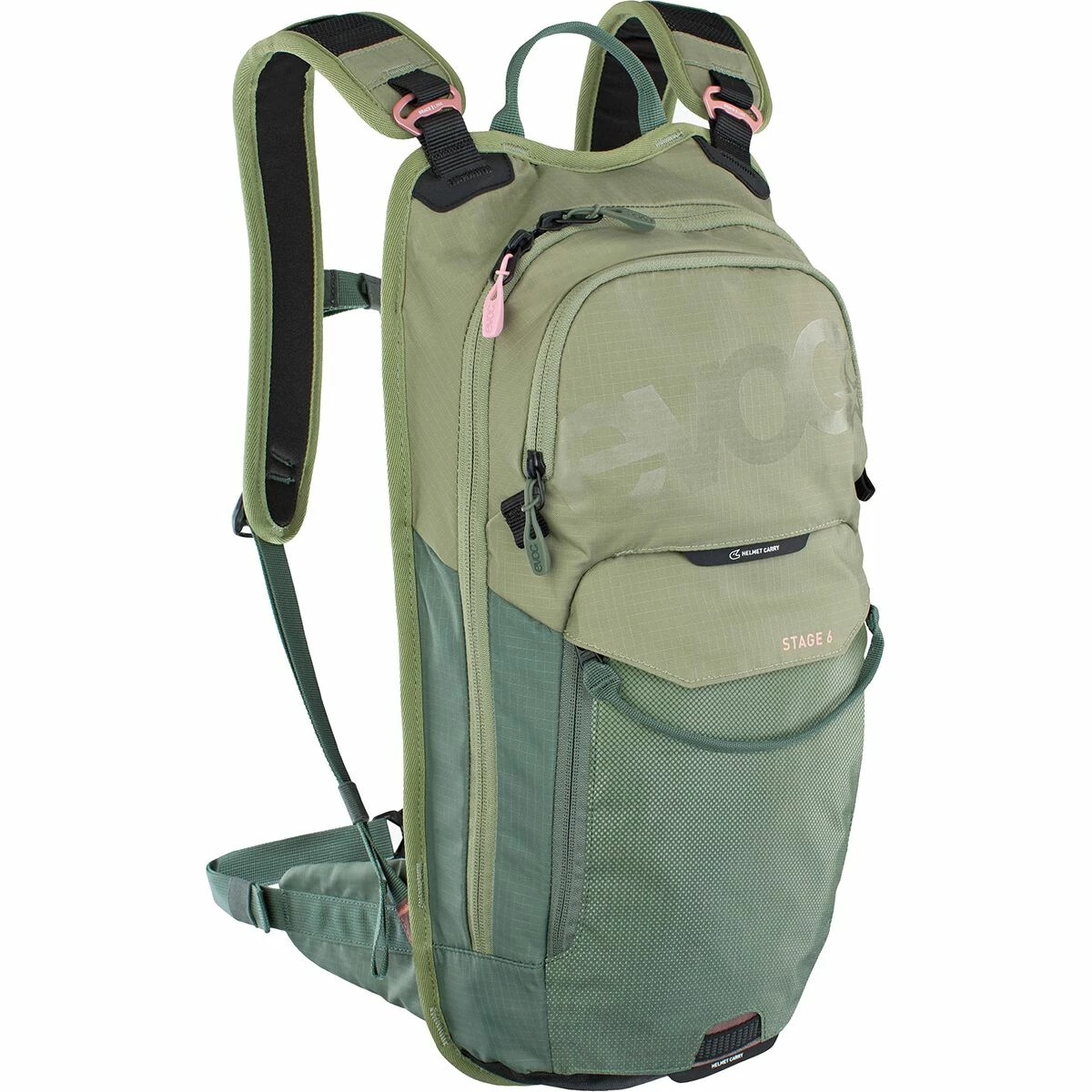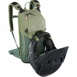 Another modern benefit of the Stage 6L is its highly ventilated back panel, which uses a mix of mesh fabrics from Evoc to usher air through the EVA-padded straps and along the full length of the back panel to keep fresh air circulating through a sweat-prone area. Inside the bag, Evoc includes space for a dedicated tool compartment, and on the outside, a lightweight attachment system that accommodates a range of off-road helmets, including full-face, without adding unnecessary bulk.