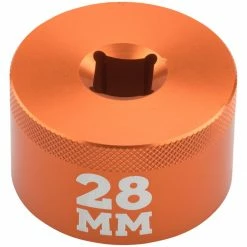 Whether you’re performing an air spring service, or adding volume spacers to your Fox fork, the Fork Topcap Socket is a necessary tool for loosening the top cap in order to access the air spring. In recent years, it was a struggle to find the right socket for the job. Top caps are a fraction of the height of normal nuts, and most sockets are chamfered, which increases the risk of rounding out your top cap. This socket is chamfer-less, sitting flush against your top cap to maximize the contact points and provide a secure fit, reducing the chance of damaging your top cap. It comes in a durable orange-anodized finish, and fits 3/8in ratchet drivers. The 26mm socket fits 32-series forks and some 34’s, the 28mm fits most 34-series forks, and the 32mm size is for 36, 38, and 40-series forks, but it’s never a bad idea to measure your top cap diameter beforehand, just to be sure.