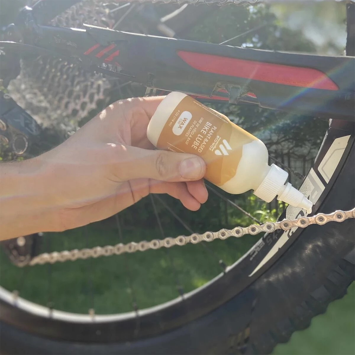 - Wax-based lubricant for dry, desert-like riding conditions
