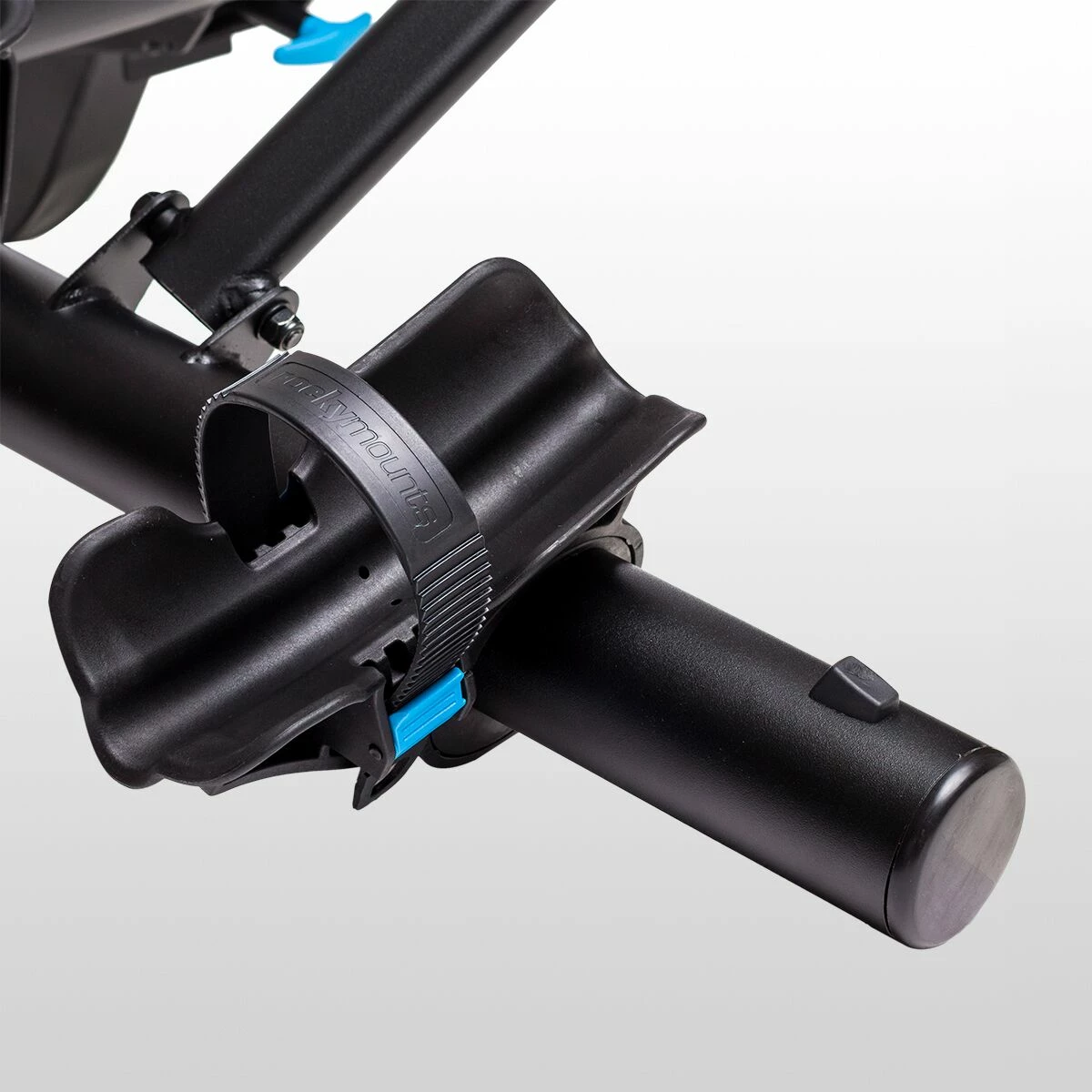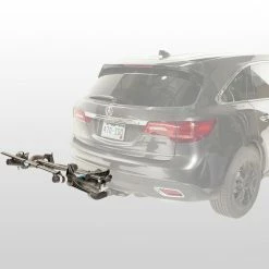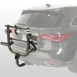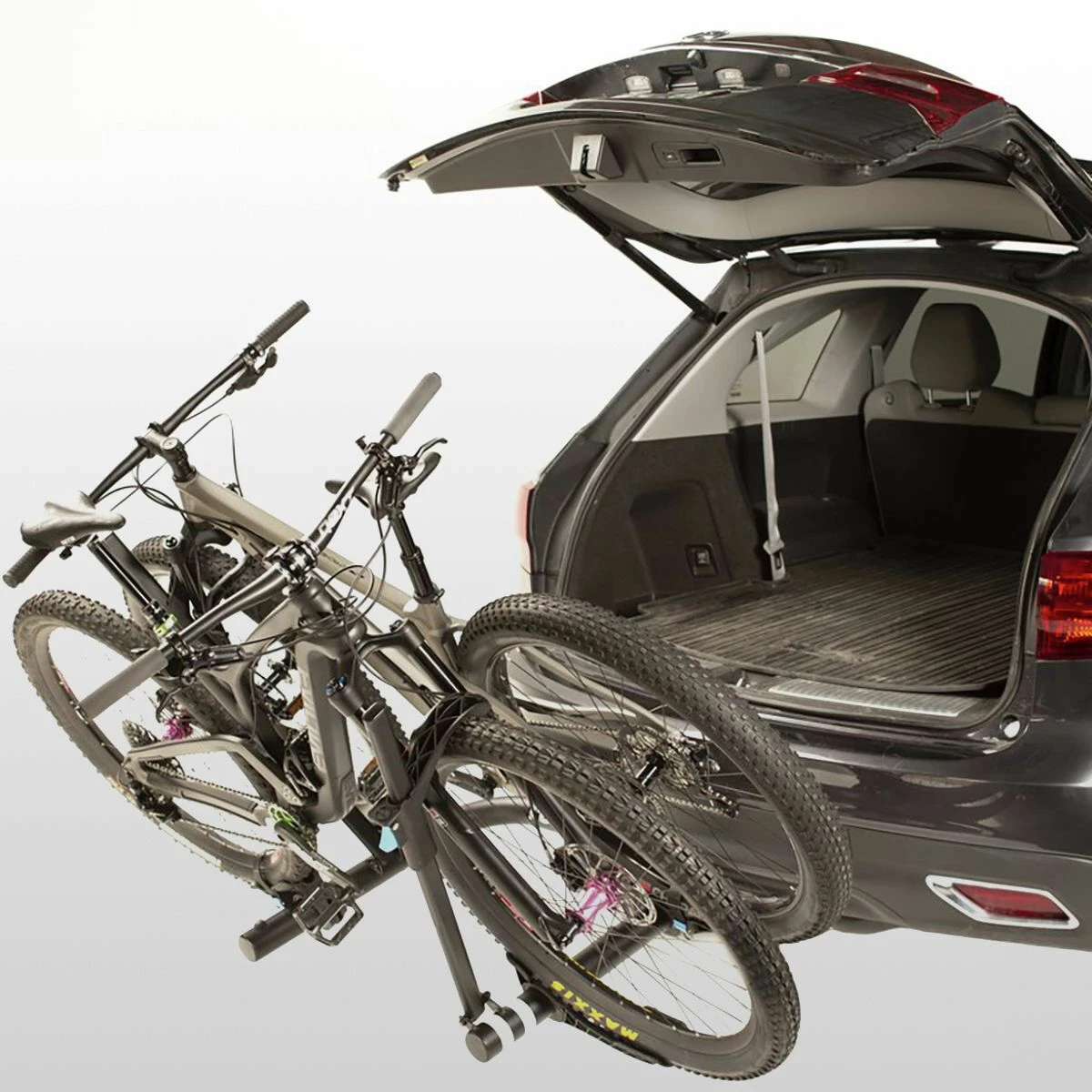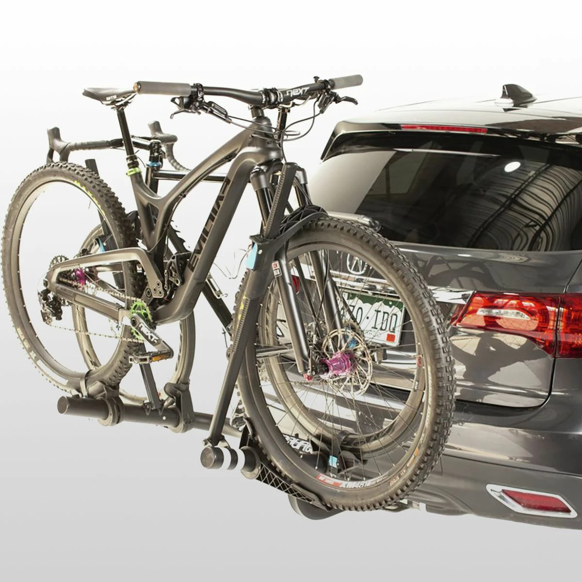 As wallet-friendly as it is feature-filled, the RockyMounts WestSlope 2-Bike Hitch Rack gets you and your friend’s bikes safely from the garage to the trailhead with quick, secure, and hassle-free convenience. Living up to its name, this rack’s frame body is sloped to create a tiered mounting arrangement that ingeniously eliminates handlebar interference between the bikes. By using a soft-touch wheel hook and a ratcheted swing arm, the WestSlope provides a secure fit without any harmful contact between your bikes and car. Plus, the rack folds flat against the vehicle when not in use, and tilts down 30 degrees to allow for easy hatch access to your gear.