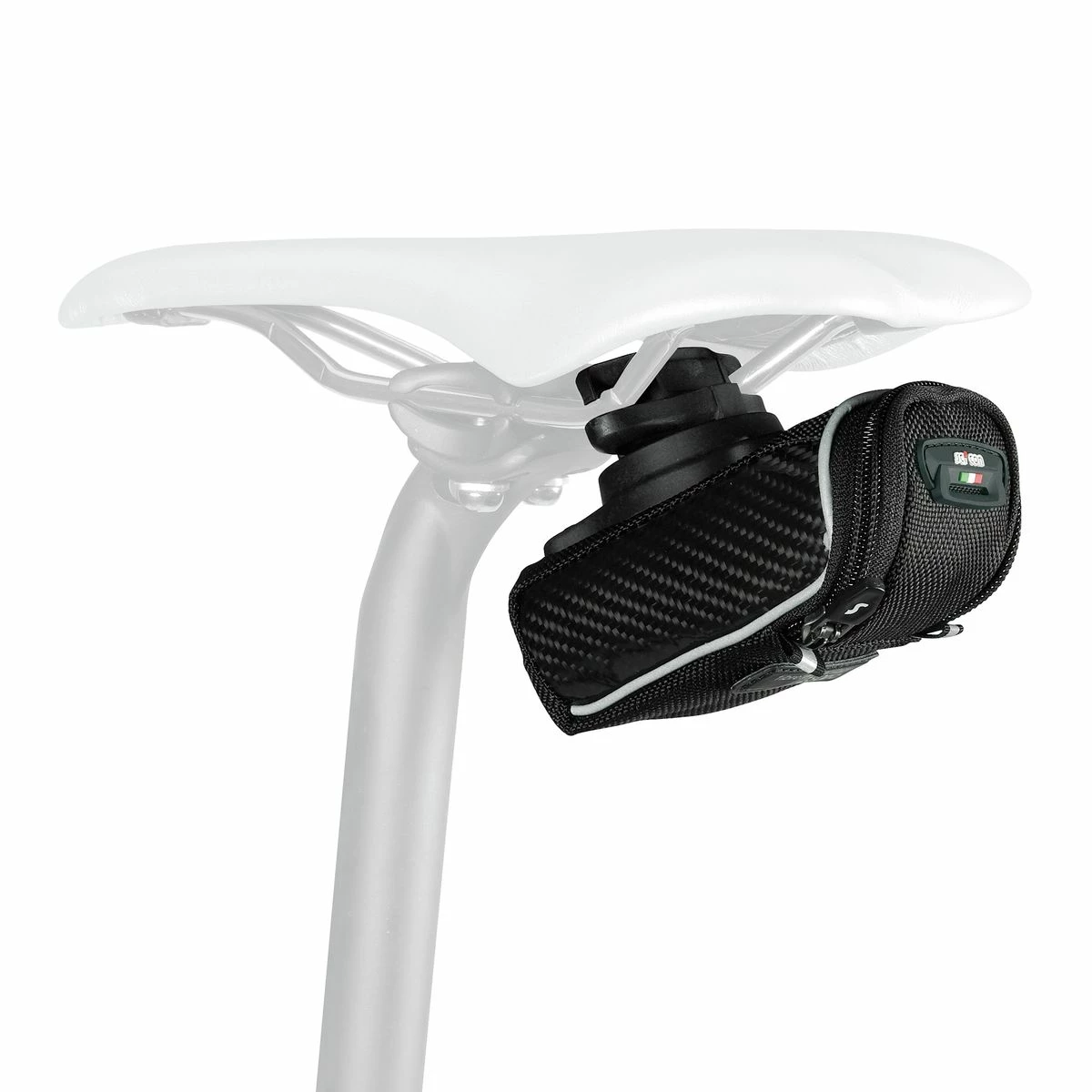 A zipper runs three quarters of the way around the bag, giving you easy access to everything inside. The interior of the bag is open, a single cavity, with a hook-and-loop strap for compressing the bag. Reflective piping runs along the seam between the carbon fiber and Cordura panels. The SciCon Phantom 230 Roller 2.0 Saddlebag measures 7×5.5x12cm and has a volume of 230 cubic centimeters (14.354 cubic inches).