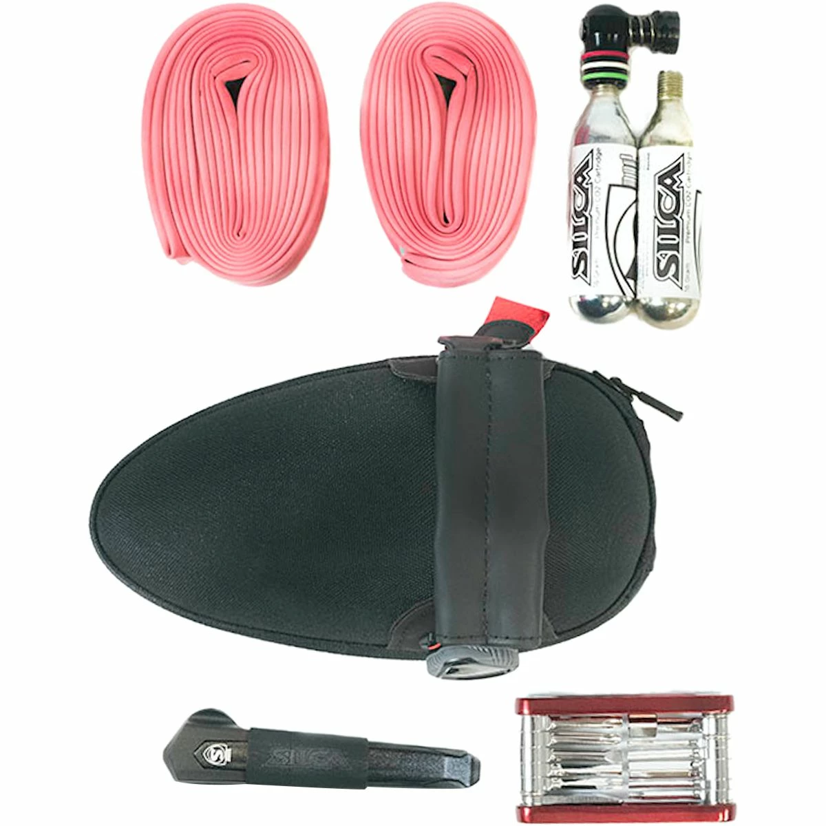 inner tubes along with a set of tire levers, multi-tool, CO2 dispenser, and up