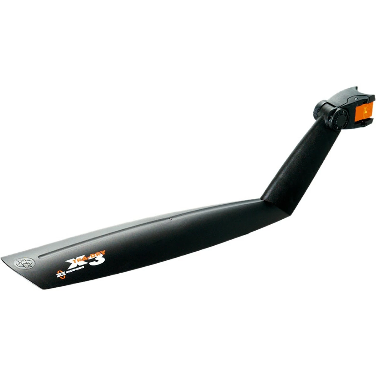 The SKS X-Tra-Dry QR Fender is an update of the classic backscratcher fender. The backscratcher is so named for the shape. It’s long and straight, with a curve at one end. Off the bike, it could do double-duty as a back scratcher. On the bike, it has a quick release strap that grabs onto the seat post or seat tube, a pivot behind the quick release to adjust the angle of the fender, and a long, narrow fender surface that keeps the chamois from getting too soggy and rooster tails from soaking the back. Can be used both on road and off. The color is Black. Weight is 140g.