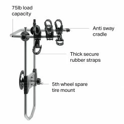 You don’t want to have to choose between having a spare and having your bike. Be prepared and equipped with both with the Thule Spare Me 2 Spare Tire Carrier. It attaches easily to regular or oversized tires and includes locks to secure your bike to the rack and the rack to your vehicle for maximum protection. Stay-Put cradles provide-anti-sway stability, and arms fold down for streamlined driving when not in use.