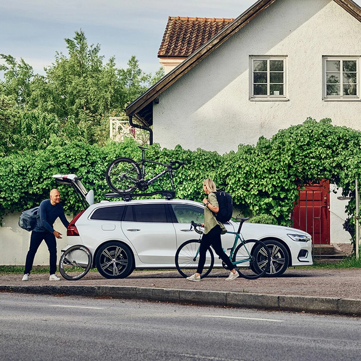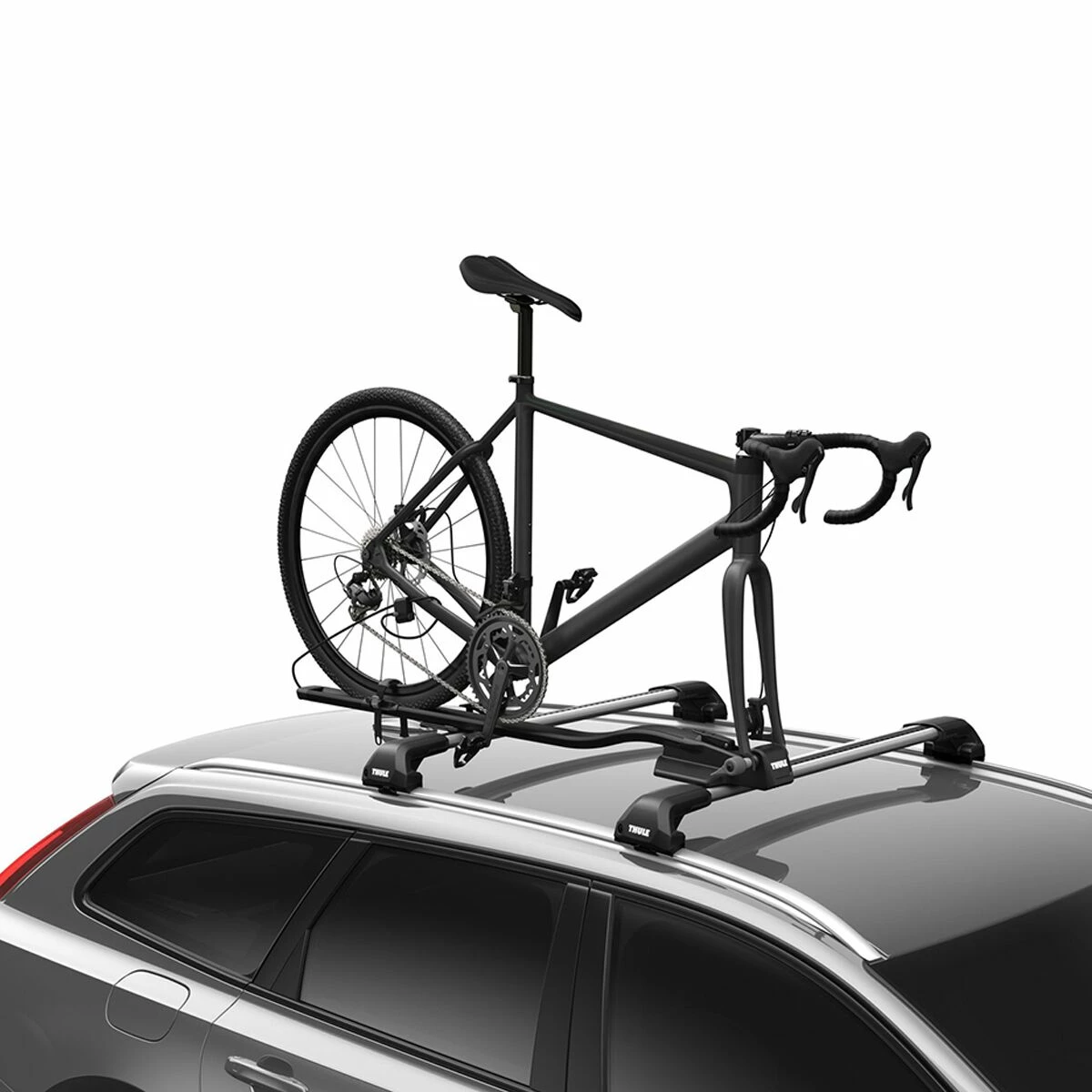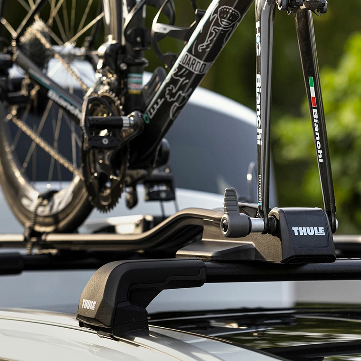 Weโre keeping our priorities up top with the Thule FastRide Bike Mount. Built for hauling our road bikes, this sleek and easy-to-use rack safely hauls precious cargo on our roof. This rack is compatible with Thule locks, easily keeping our bikes safe from prying hands at various gas stops along our journey. The lightweight rack easily attaches to universal roof crossbars, so weโre carpooling with friends confident that our bikes will make it from A to B safely.