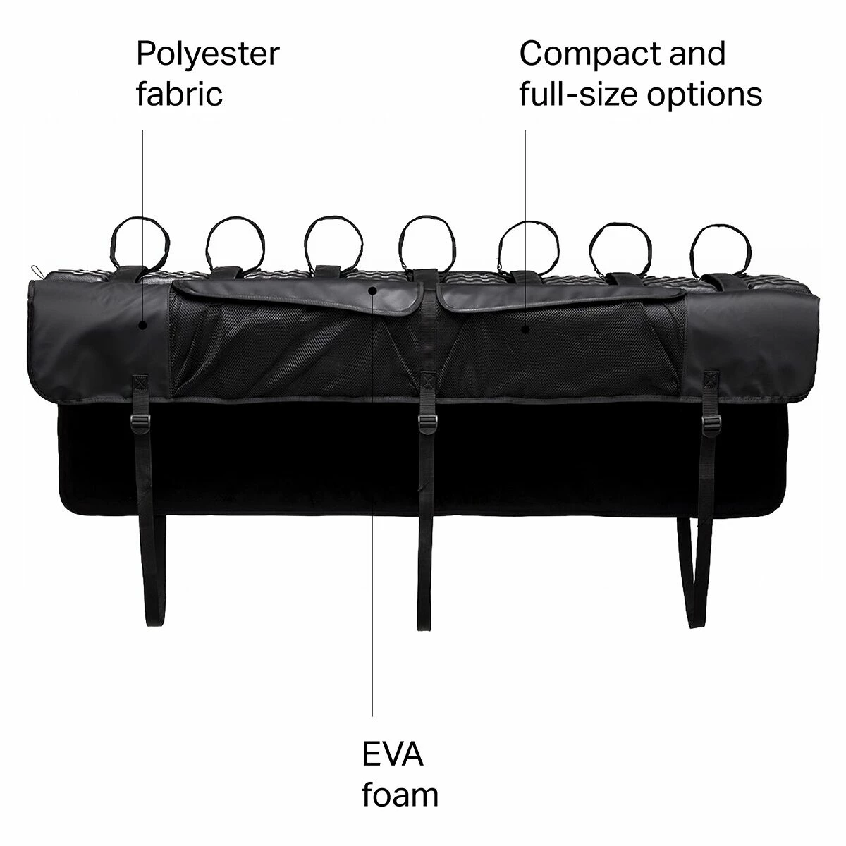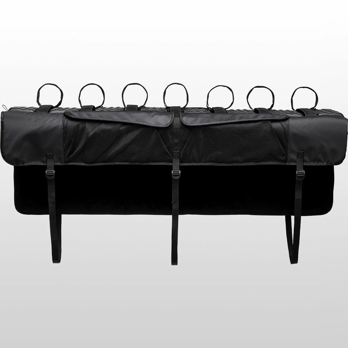 The GateMate Pro is crafted with flexible padding that adjusts to fit a wide range of tailgates, and comes in two handy sizes to lock into place on compact and full-sized trucks alike. It features hook-and-loop straps that secure your bikes into place, and inside-facing mesh pockets to keep your hydration bag and gloves safe on the road. A heavy-duty vinyl pad protects your bike, and truck, from scrapes and bumps when the grind to the top gets a little hairy, and to keep things easy, the pad features a large handle opening so your back up cam can keep an eye on things when you’re making your way from trailhead to trailhead.