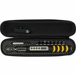 Keep your lightweight components safe with this compact and technically advanced D-Torq Wrench from Topeak. The D-Torq includes standard hex drivers in 2 – 6mm sizes, a T25 Torx, and PH2 bits that fit in its reversible ratcheting head. The D-Torque measures in 4 units including Nm, in/lb, ft/lb, or kg/cm. Its easy to read digital readout provides a visible display while there are also separate programmable audible warnings for your target torque value and another for over torque so components are installed safely and to the manufacturer’s recommended torque values. Its torque range between 1 – 20 Nm is ideal for smaller, delicate components. Includes a hard shell case for safe storage and travel.