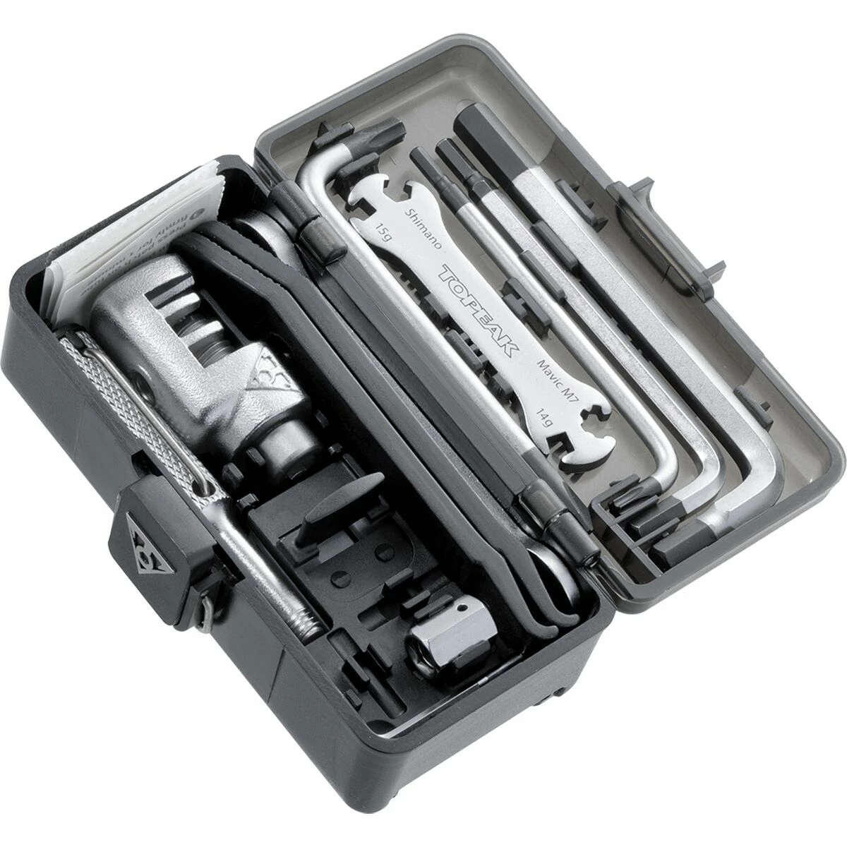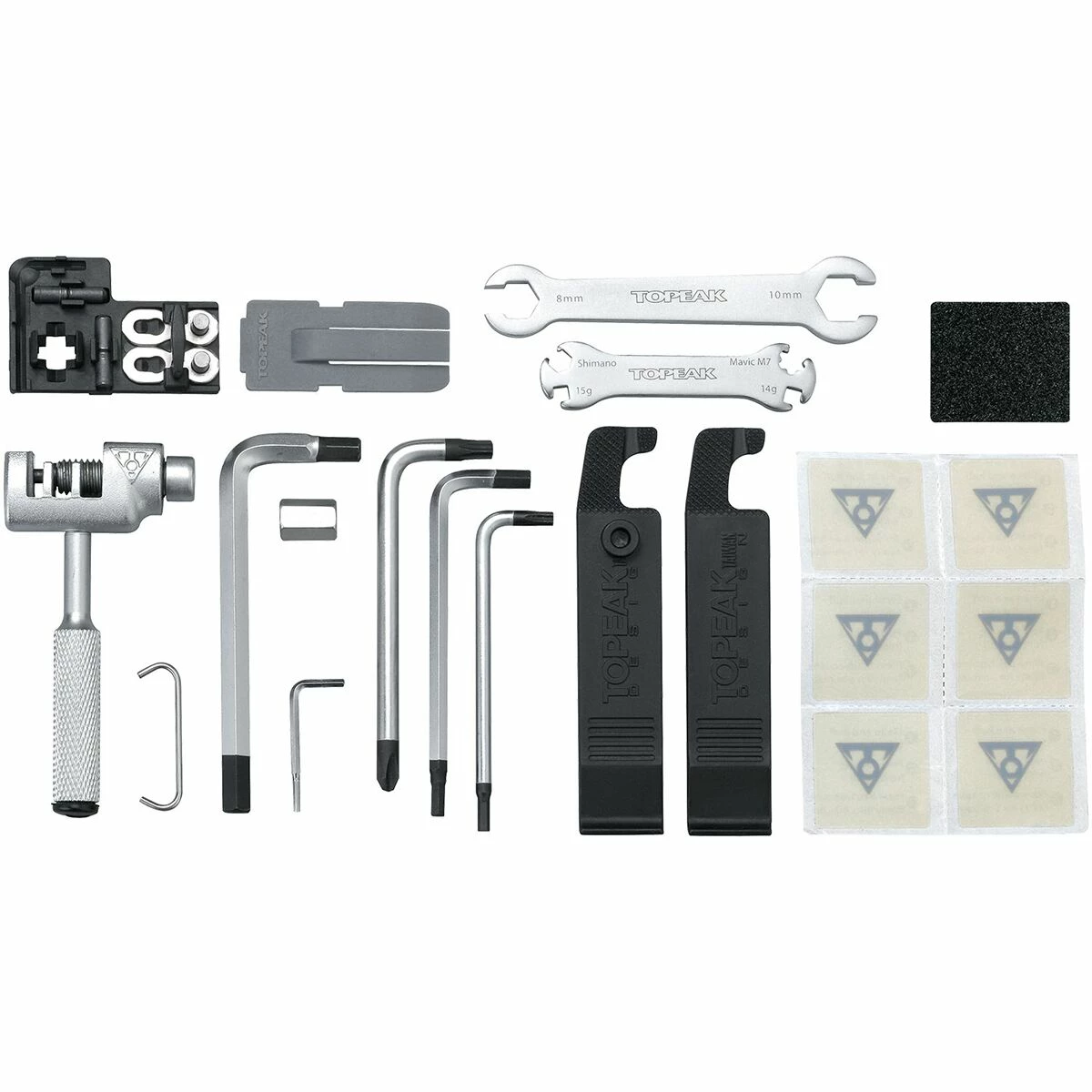 - Includes tire repair tools, chain tools, and a variety of wrenches to start
