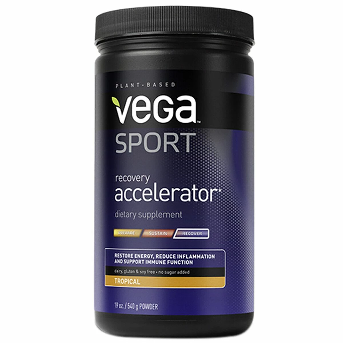 The Vega Sport Recovery Accelerator is available in Tropical and Apple Berry flavors. It comes in a single 19oz container. Please note that Vega recommends taking its Recovery Accelerator within 20 minutes of concluding your workout.