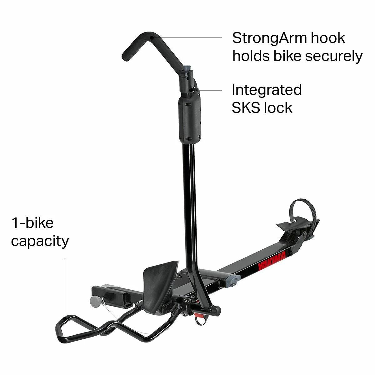 Yakima designed the SingleSpeed Hitch Rack for cyclists regularly carrying only a single bike, whether they’re moving across the country or simply driving to the trail head to crush miles of technical singletrack. Inspired by the larger HoldUp in design, the SingleSpeed features a StrongArm hook that clamps securely over your front wheel and tire—all without contacting your carbon frame or scratching precious paint. The rear strap ratchets in place to hold down the rear wheel, so it doesn’t have the ability to shift or migrate around during transport.