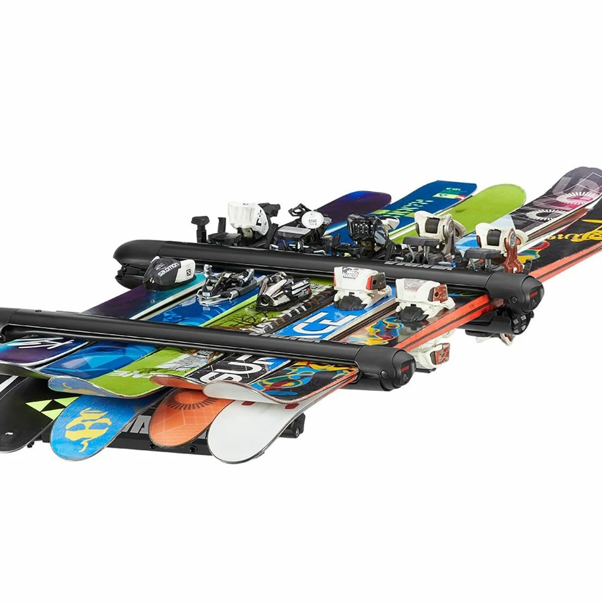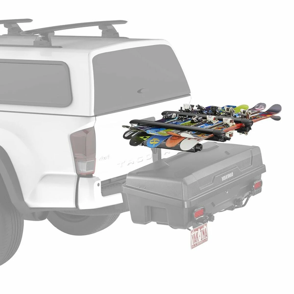 Be the hero of your next ski trip with friends when you install the Yakima EXO SnowBank to haul your skis and boards around the mountain. The SnowBank is wide enough to accommodate five pairs of skis or four boards ,and mounts easily to your EXO SwingBase or EXO TopShelf roof rack. A large button makes it easy to open and close the SnowBank with mittens or gloves on, and the SKS lock system keeps your gear safe when you’re warming up in the lodge.